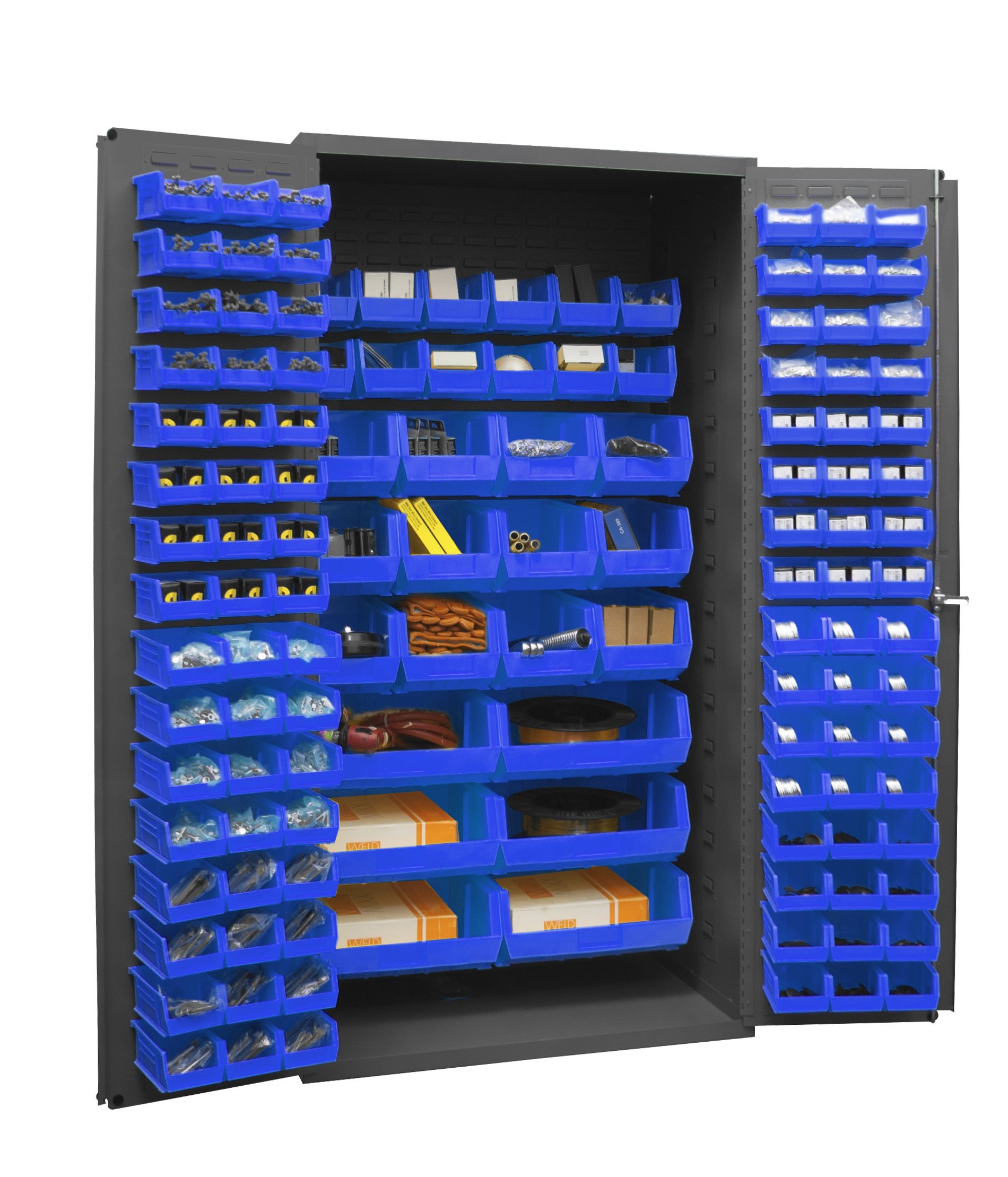 Durham 2501-BDLP-126-5295 Lockable Bin Cabinet with 126 Blue Hook-On Bins, Flush Door Style, 36" Wide, 16 Gauge, Gray