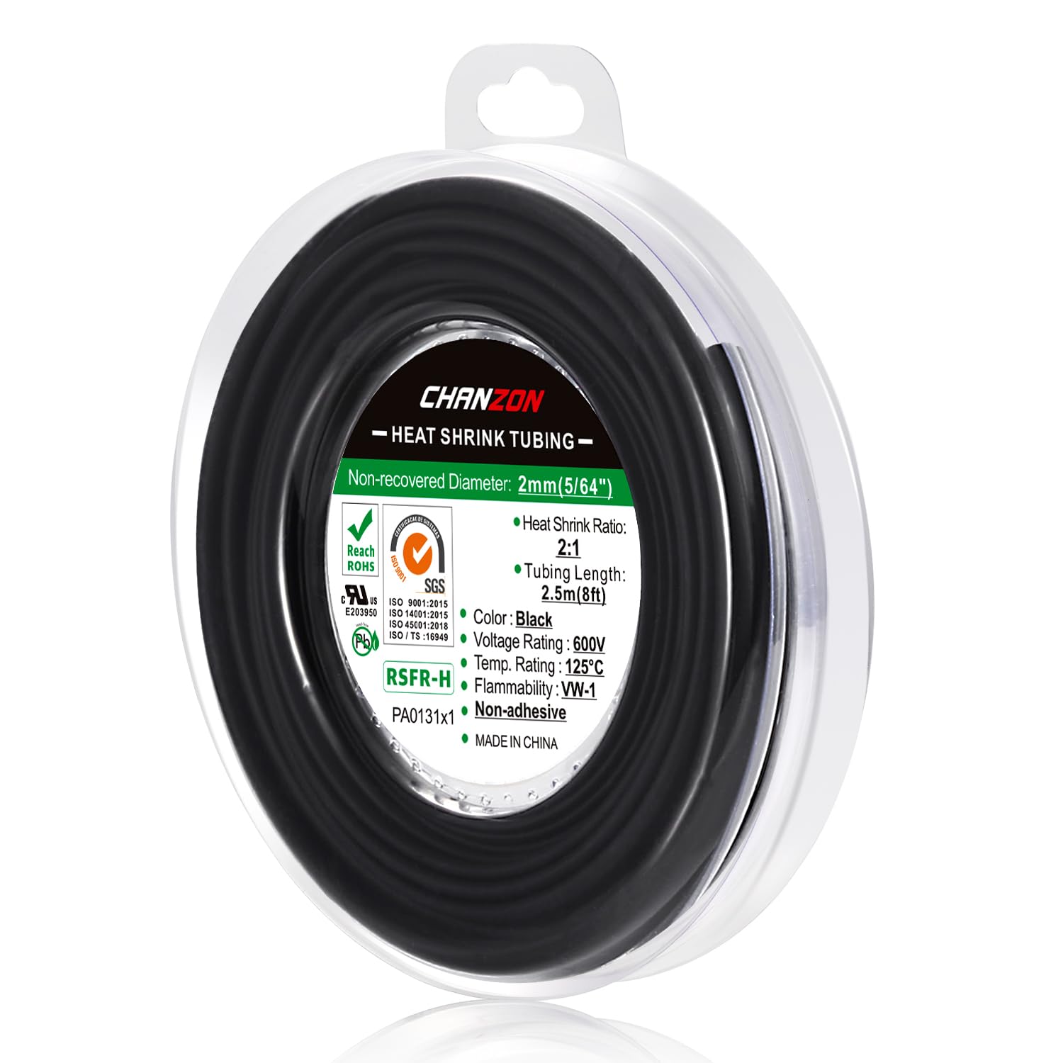Chanzon 2:1 Ratio 5/64" (2mm) Heat Shrink Tubing 8Ft Roll (2.5M Total Length) Black Polyolefin Sleeving Wrap Shrinking 2 to 1 1pcs