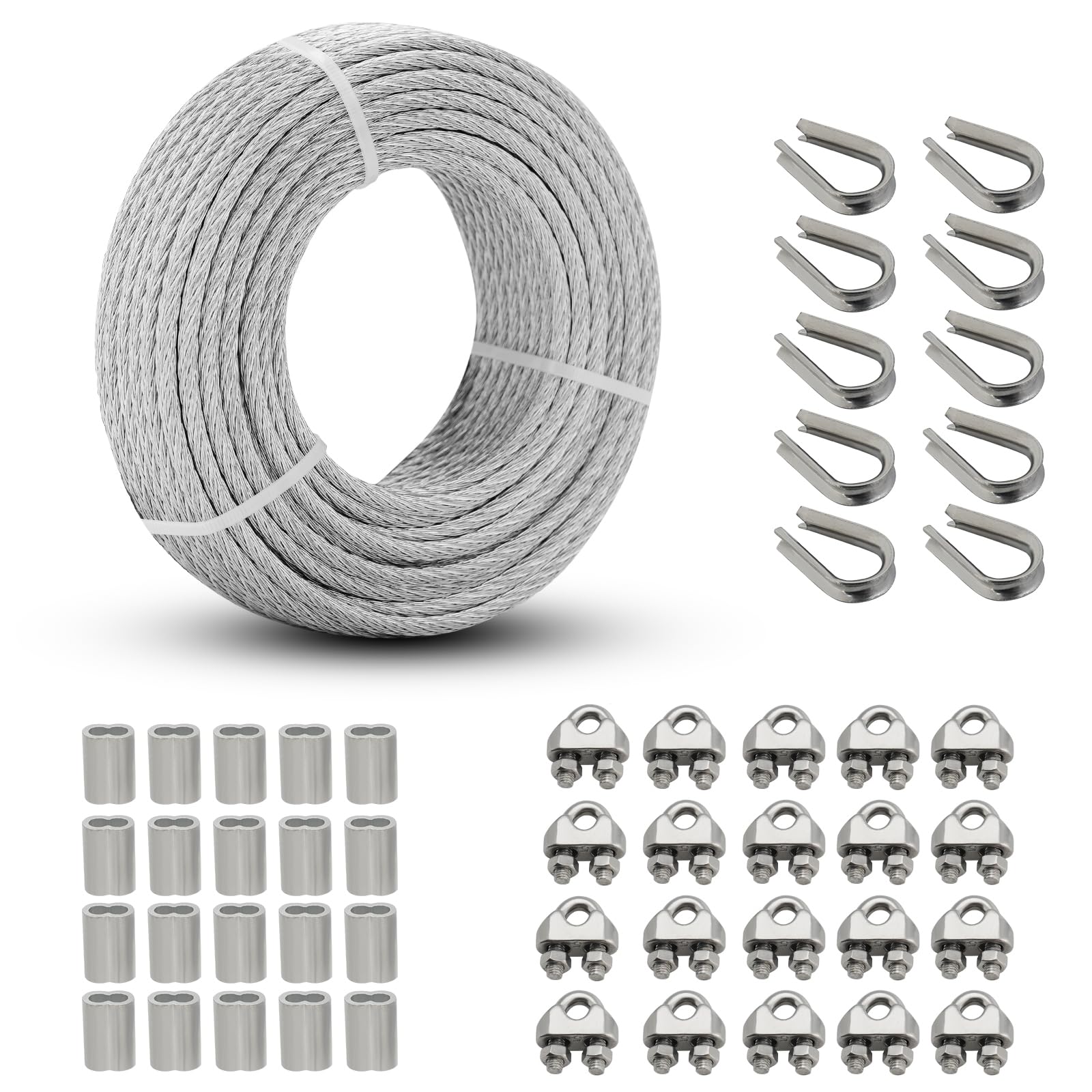 Growglow Galvanized Steel Wire Rope 100ft 7x7 Aircraft Cable 1/8 Cable Steel Cable Kit with Clamp Thimble Sleeve for Clothes line Anchored Shed